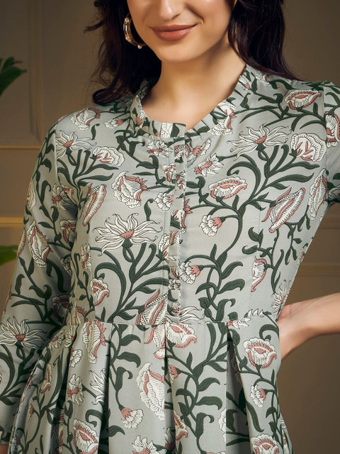 Layer this floral dress with a cozy neutral-toned cardigan or a wool coat, add opaque tights and ankle boots for warmth, and accessorize with a chunky scarf and a beanie for a comfortable, chic winter look.