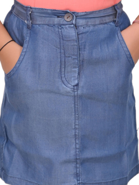 Blue denim Mini skirt, has an elasticated waistband, 3 pockets with button closure and flared hem