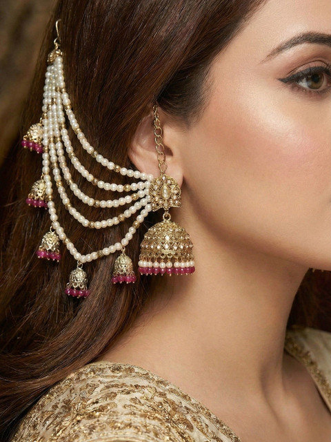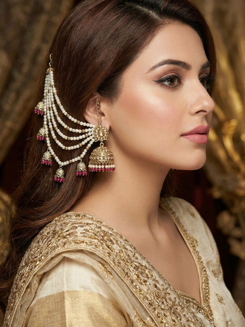 Let these layered ear chains become the focal point of your outfit by pairing them with heavily embroidered sarees, lehengas or flowing anarkalis. Style your hair in a sleek bun or soft waves to highlight the cascading strands, and keep other jewelry minimal for a balanced, regal appearance.