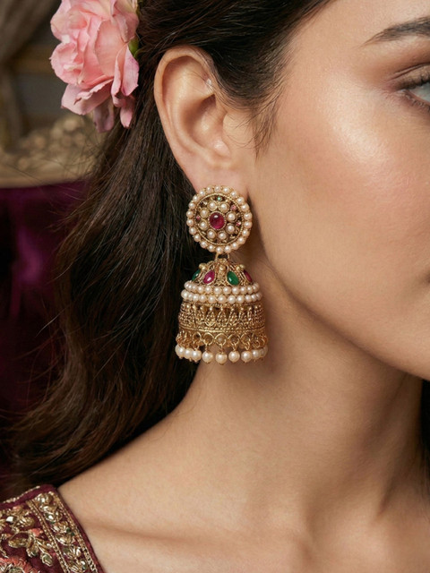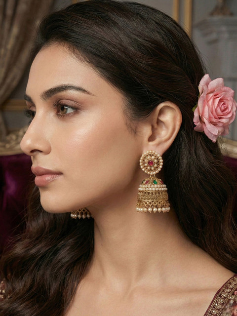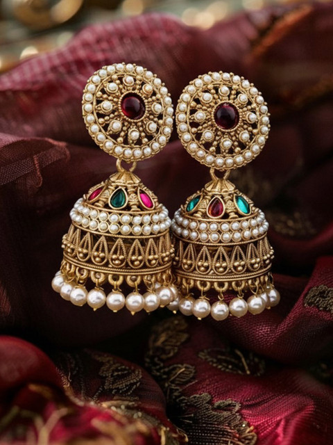 Gold-toned contemporary jhumkas, silver-plated has artitifical stone studded details.