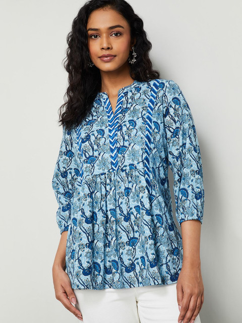 Floral printed top with a band collar, 3/4th sleeves, and a gathered yoke. Features a chevron printed back yoke.