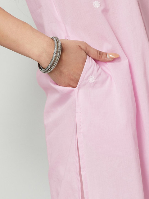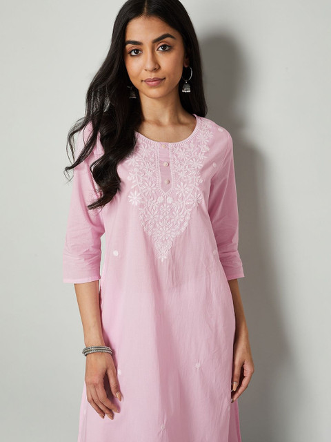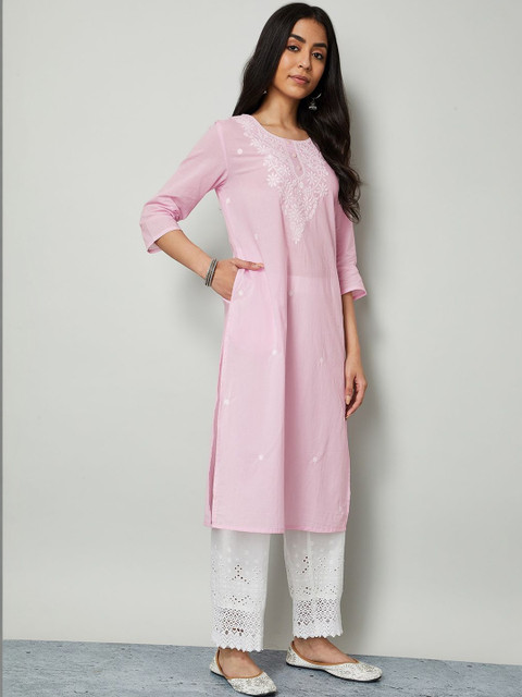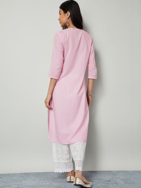 A straight kurta adorned with embroidery, featuring a round neck, threequarter sleeves, and a handy pocket.