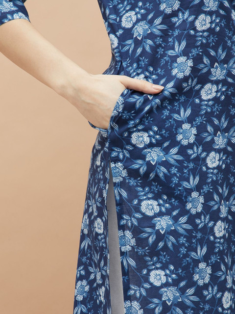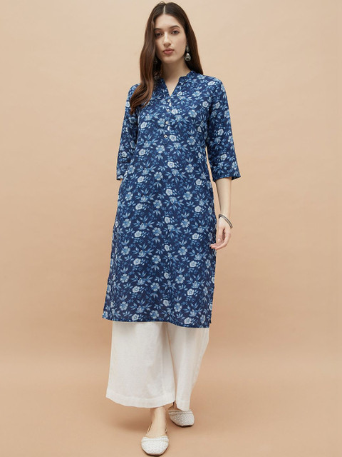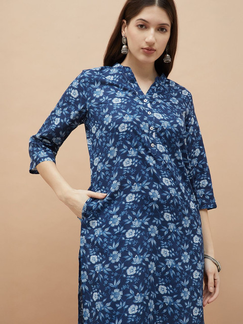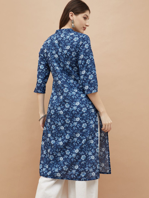 Straight kurta with floral print, mandarin collar, straight hemline, and 3/4th sleeves. Perfect for casual occasions.