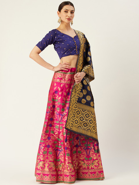 Pink and navy blue woven design semi-stitched lehenga & unstitched blouse with dupatta