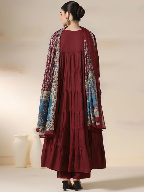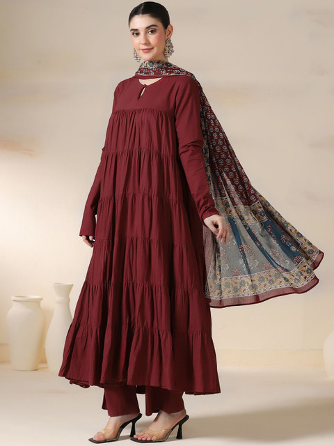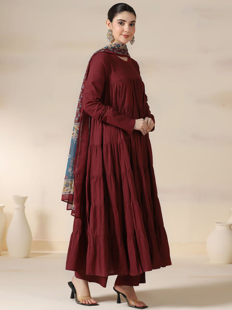 Mizaz Women Solid Cotton Anarkali Kurta with Trousers & Dupatta