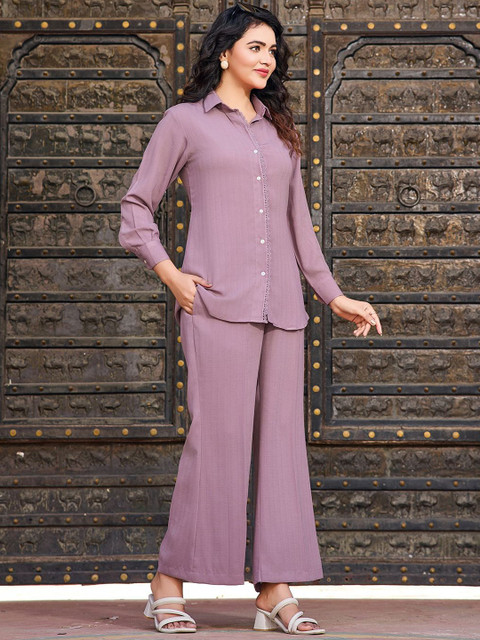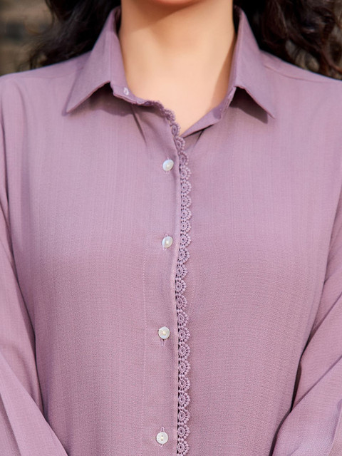 Pink solid shirt, has a shirt collar and long sleeves, secured with button closure