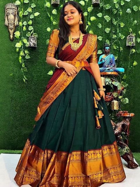 Green woven design semi-stitched lehenga, has drawstring closure, flared hem,