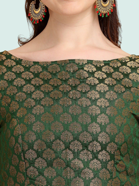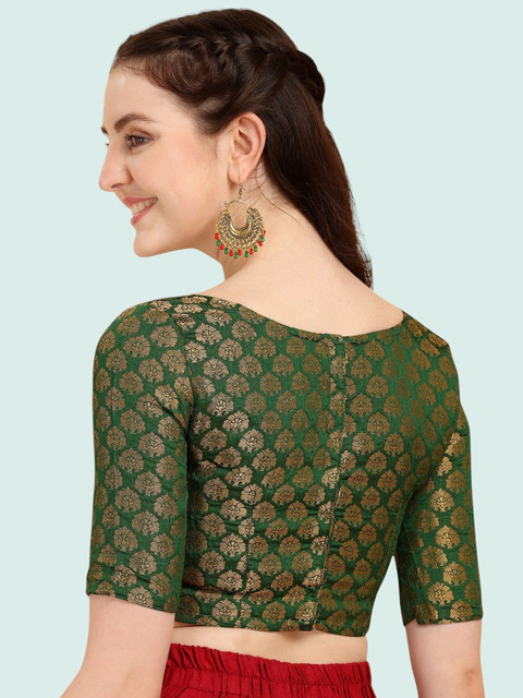 Green and gold-toned woven design blouse has a boat neck, short sleeves, and hook and eye closure
