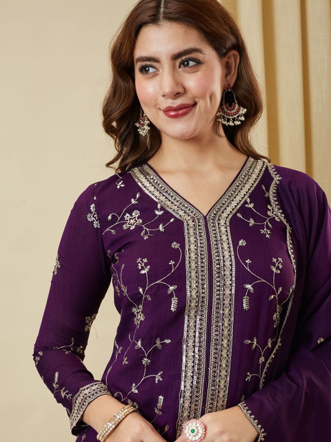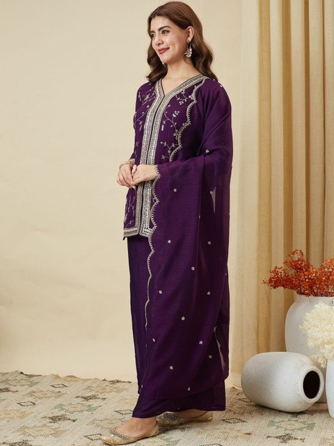 MOKOSH Women Ethnic Motifs Embroidered Regular Thread Work Art Silk Kurta with Palazzos & With Dupatta