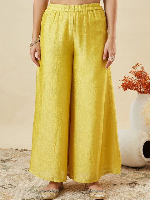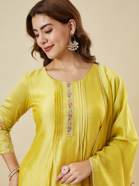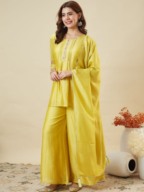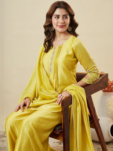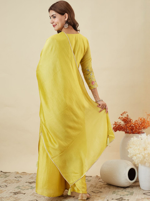 Yellow & Pink Embroidered Kurta with Palazzo & Dupatta