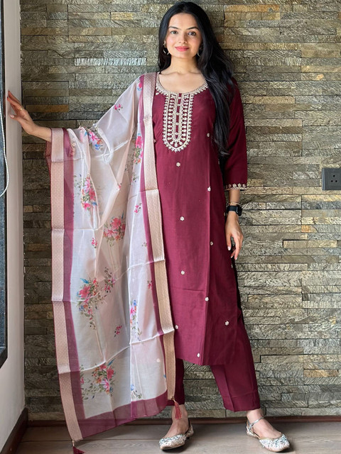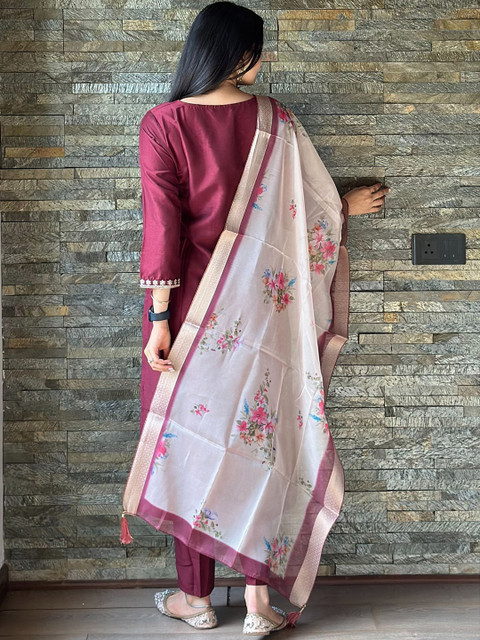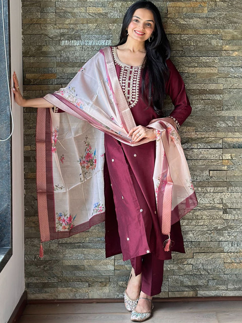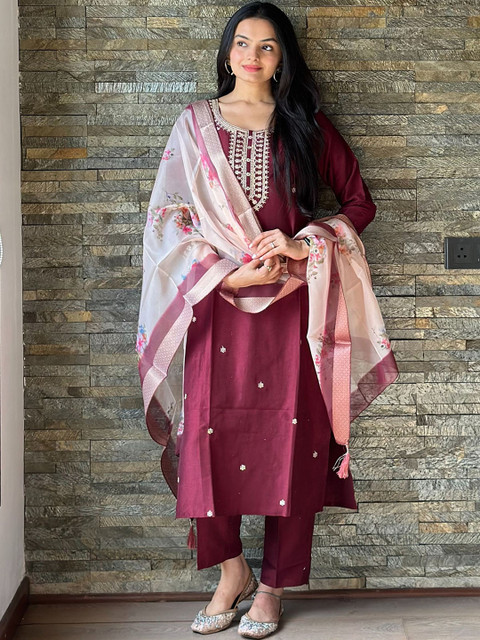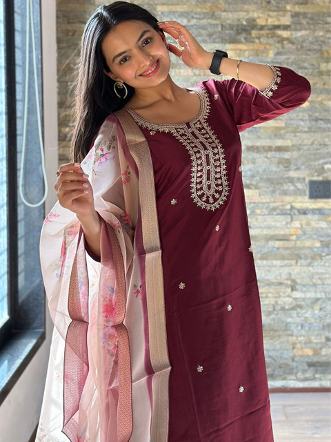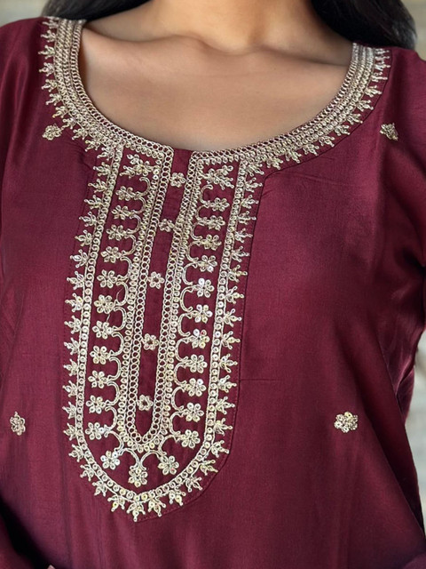 Maroon embroidered Kurta with Trousers with dupatta