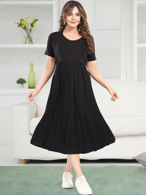 • Black and black self design fit & flare dress