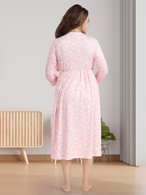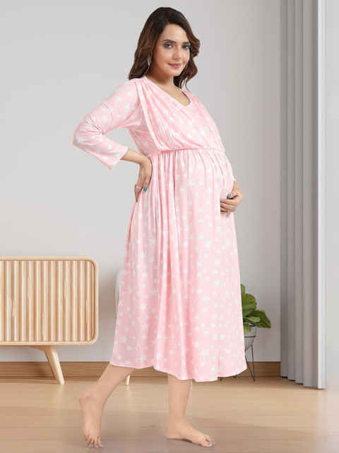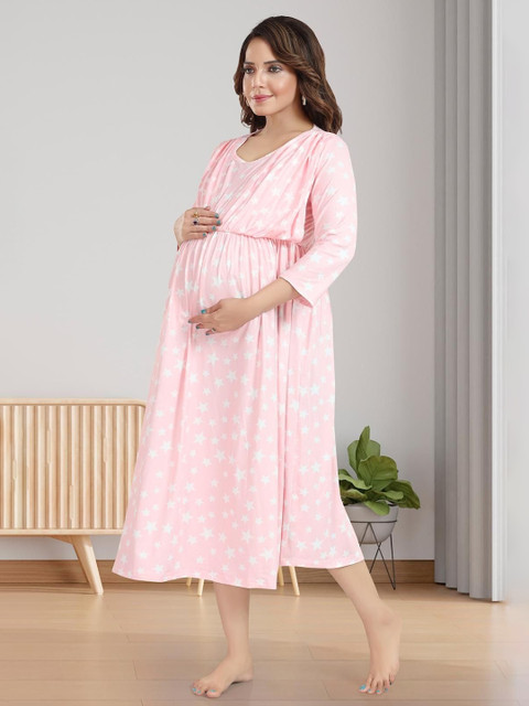 MomsBae Women Stars Printed Maternity Midi Nightdress