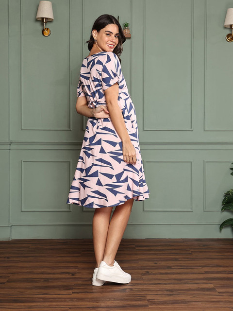 - Peach and navy blue geometric print fit & flare dress
