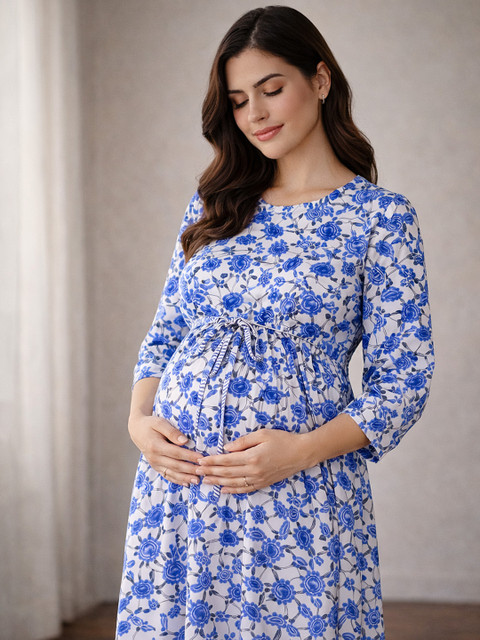 MomToBe Rayon Saphire Blue Floral Print Maternity Fit & Flare Maxi Dress