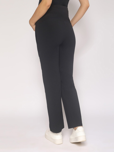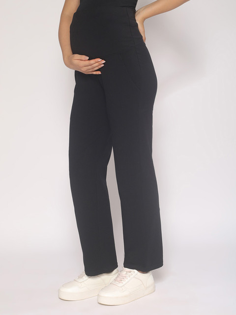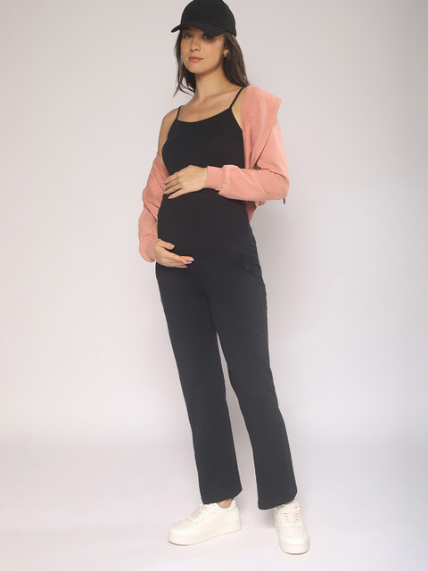 Black solid mid-rise straight-fit maternity track pants, has an elasticated waistband, slip-on closure