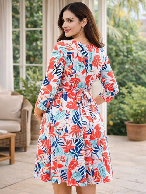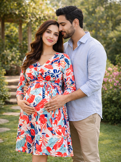 MomToBe Maternity Dress in soft rayon fabric offers a stylish knee-length design with a printed pattern. Featuring a collared neck, V sleeves, a side pocket, and a 16-inch vertical zipper for easy nursing access, it ensures comfort and a perfect maternity fit for effortless wear.