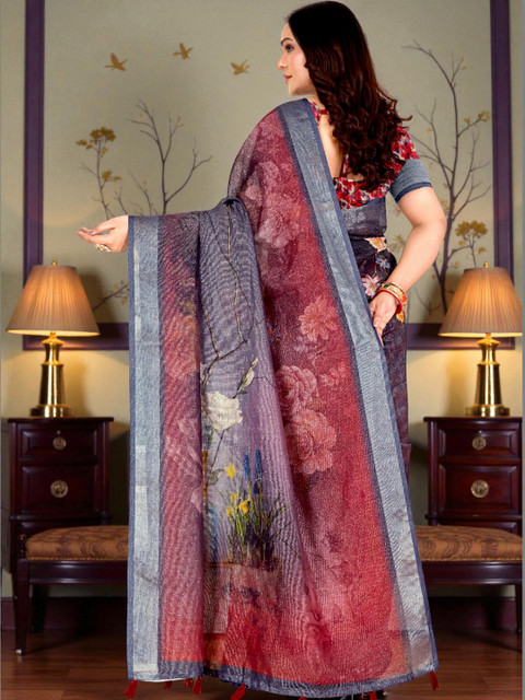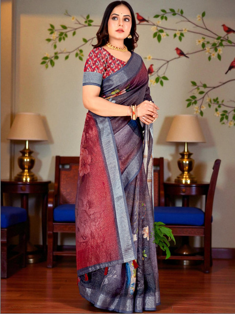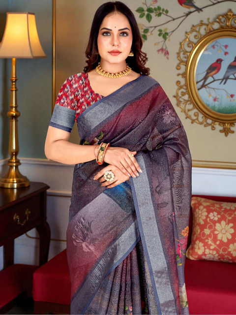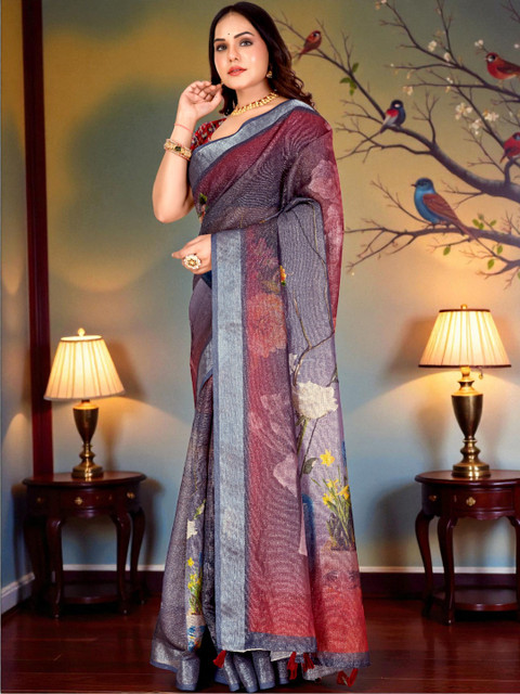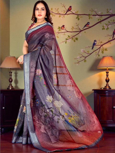 - Floral printed saree with woven design border border