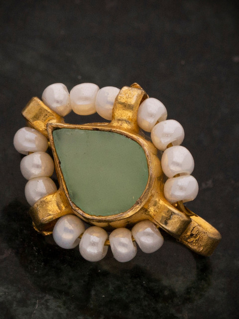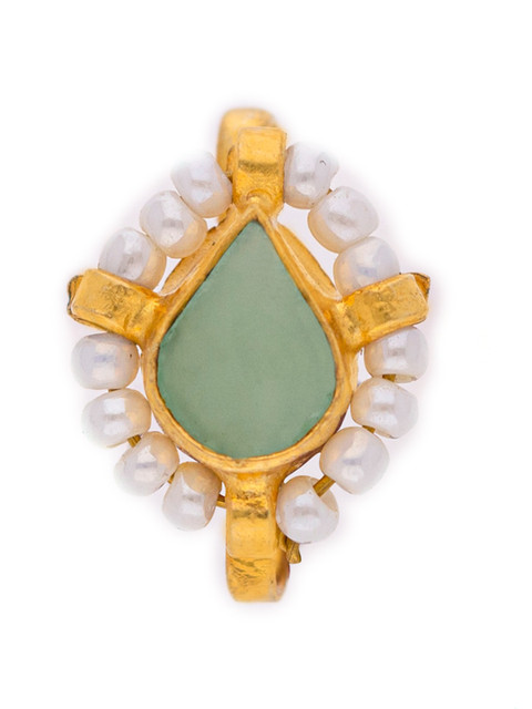 Gold-plated white sea green stone studded nose pin has white pearl beaded detail