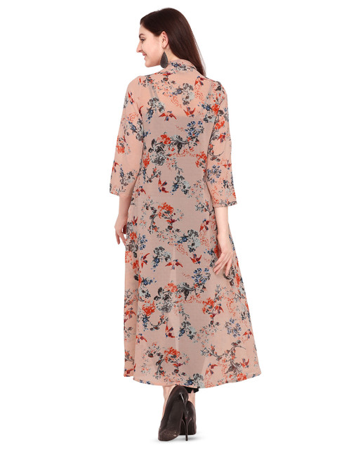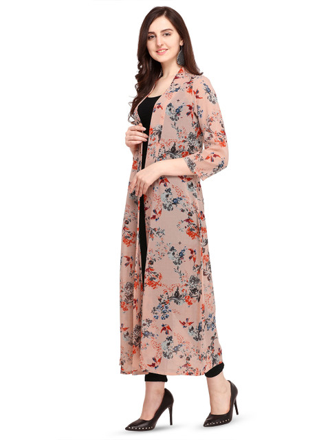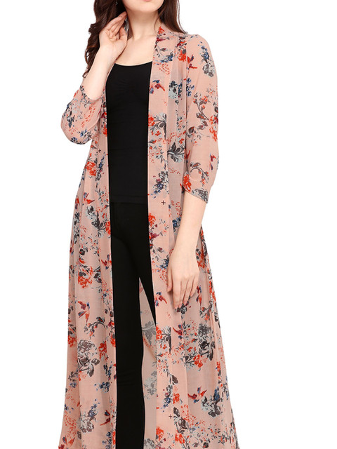 Pink and blue floral printed open front longline shrug ,has a collarless, three-quarter sleeves, straight hem