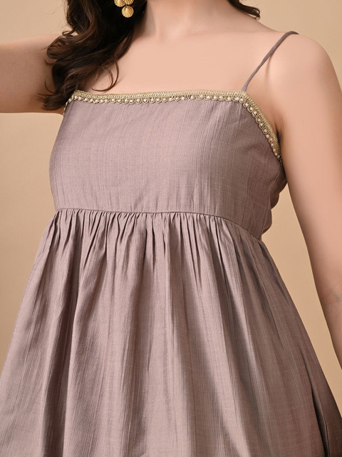 Grey self design regular-fit peplum top, has shoulder strap, sleeveless and slip-on closure