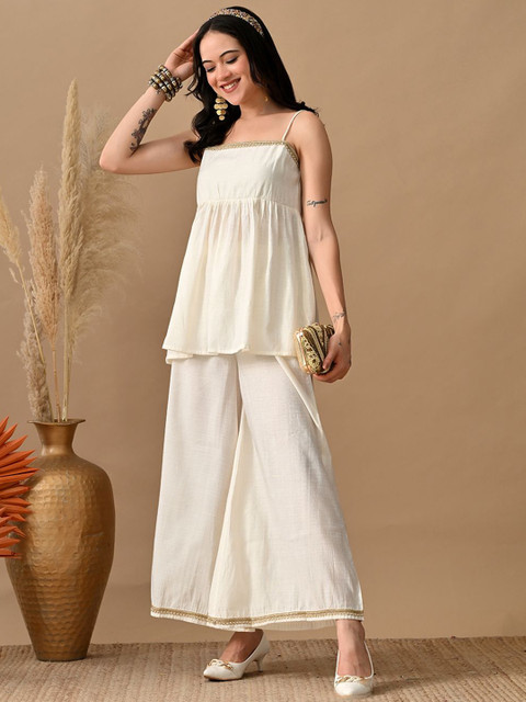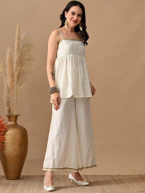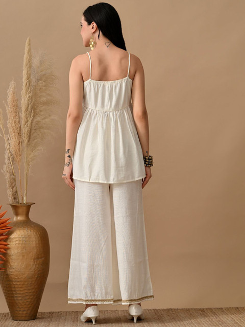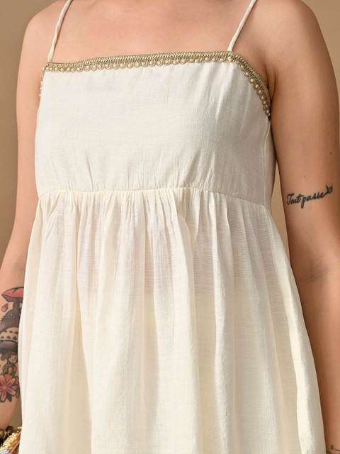White self-design regular-fit peplum top, has shoulder strap, sleeveless and slip-on closure