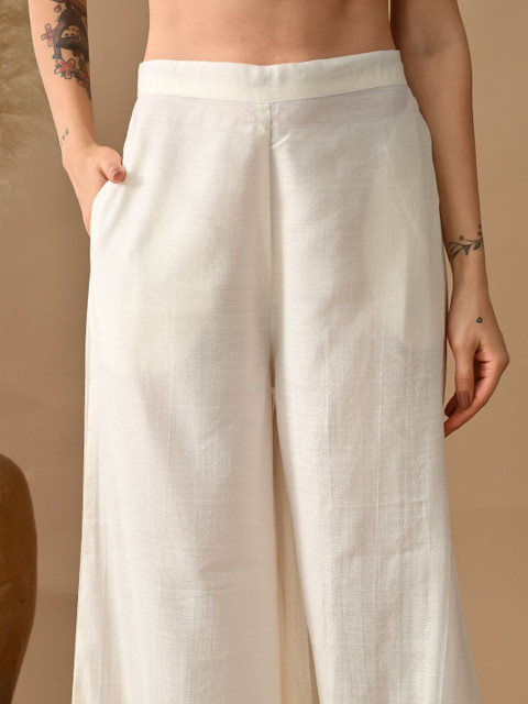 White self design trousers, has elasticated waistband with slip-on closure, two side pockets and flared hem