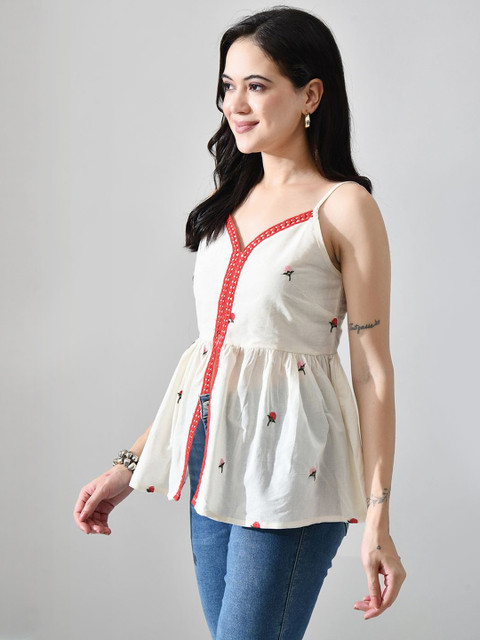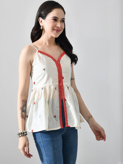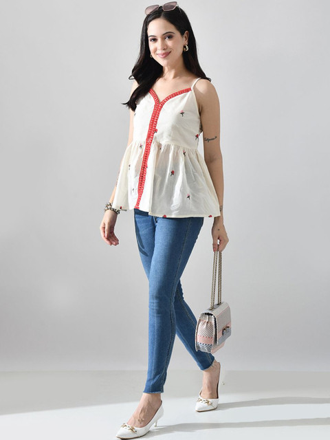 Myshka Women Floral Embroidered Sweetheart Neck Cotton Peplum Top