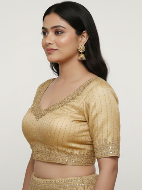 Beige embroidered saree blouse has a V-neck, three-quarter sleeves, and a side zip closure