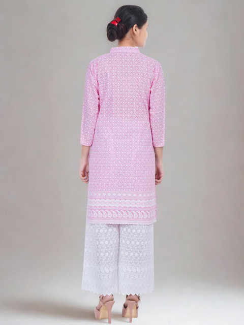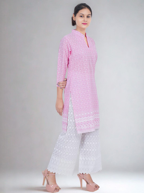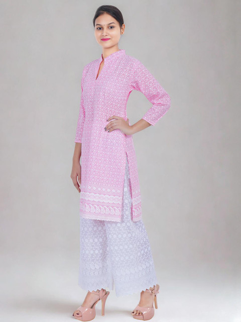Add an elegant charm to your everyday ethnic wear with this Pink chikan embroidered cotton kurta. Designed with intricate thread embroidery all over, it features a straight silhouette, mandarin collar, and a tasteful V-notch neckline. The three-quarter sleeves and subtle hem detailing lend it a refined and graceful appeal. Ideal for daily wear, office, or casual gatherings.