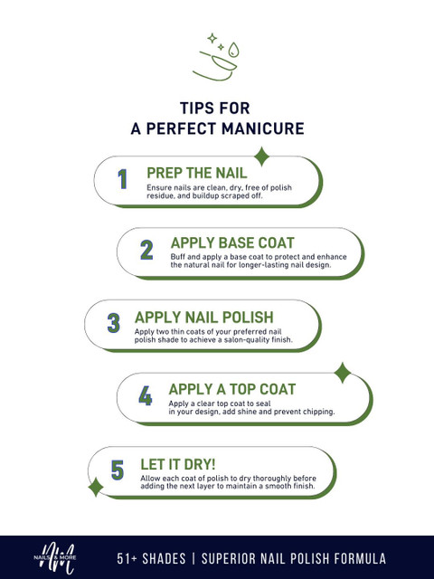 | How-to-Apply | 1.PREP THE NAIL Ensure nails are clean, dry, free of polish residue, and buildup scraped off then shape them as desired.2. APPLY BASE COAT Buff and apply a base coat to protect and enhance the natural nail for longer-lasting nail design and let it dry.3. APPLY NAIL POLISH Apply two thin coats of your preferred nail polish shade to achieve a salon-quality finish. Add a second coat for intense color4. APPLY A TOP COAT Apply a clear top coat to seal in your design, add shine and prevent chipping.5. LET IT DRY! Allow each coat of polish to dry thoroughly before adding the next layer to maintain a smooth finish. For best results, avoid water exposure for the first hour after application |