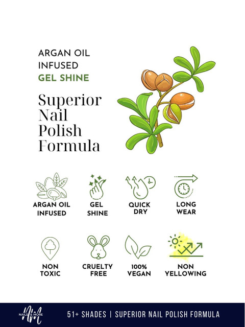 | Ingredients | Argan oil, nitrocellulose, butyl acetate, ethyl acetate, iso propyle alcohol, acrylate copolymer, acetyl tributyl citrate,steralkonium hectorite, d&c approve pigment |