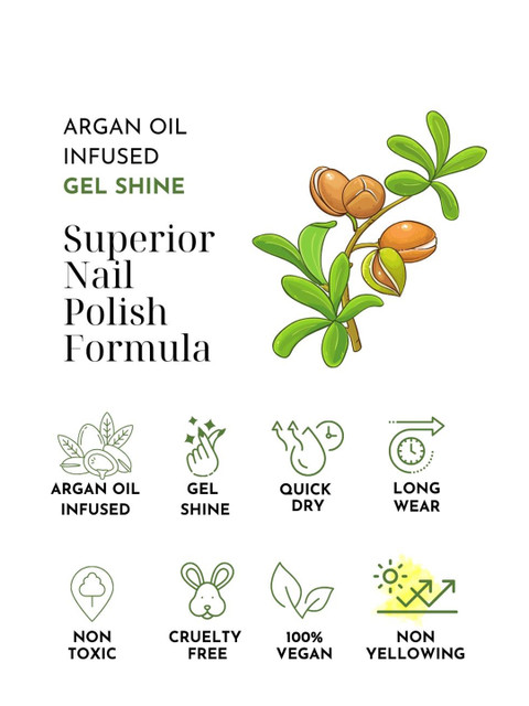 | Ingredients | Argan oil, nitrocellulose, butyl acetate, ethyl acetate, iso propyle alcohol, acrylate copolymer, acetyl tributyl citrate,steralkonium hectorite, d&c approve pigment |