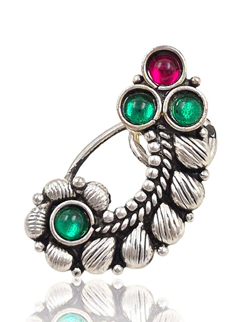 Set 1: Silver toned, green and red maharashtrian stud nosepin, has artificial stones studded details