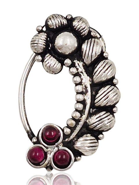 Set 3: Silver toned red maharashtrian stud nosepin, has artificial stones studded details