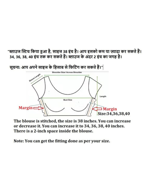 The model is wearing the stitched blouse that comes with the saree