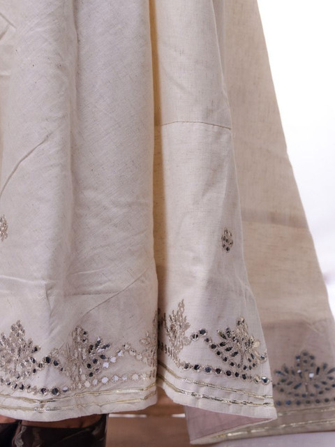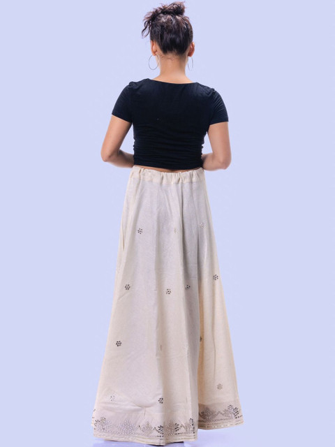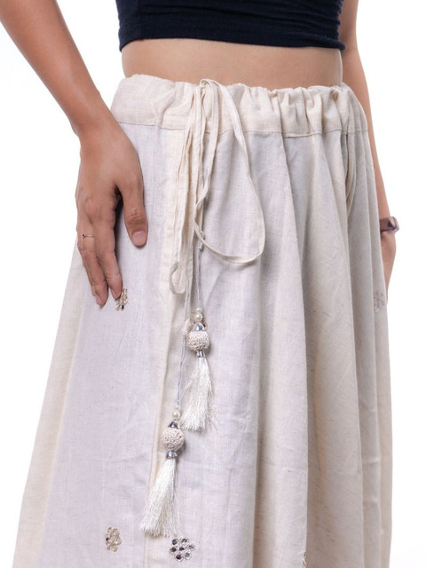 White embellished flared maxi skirt, has an elasticated waistband with drawstring closure, and a straight hem