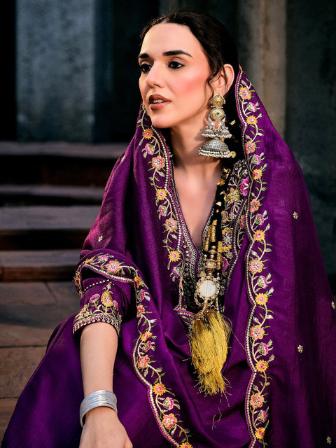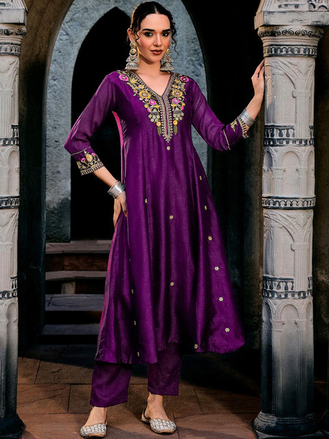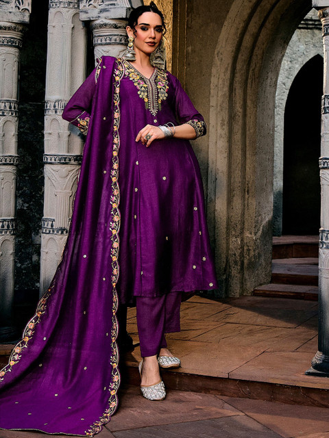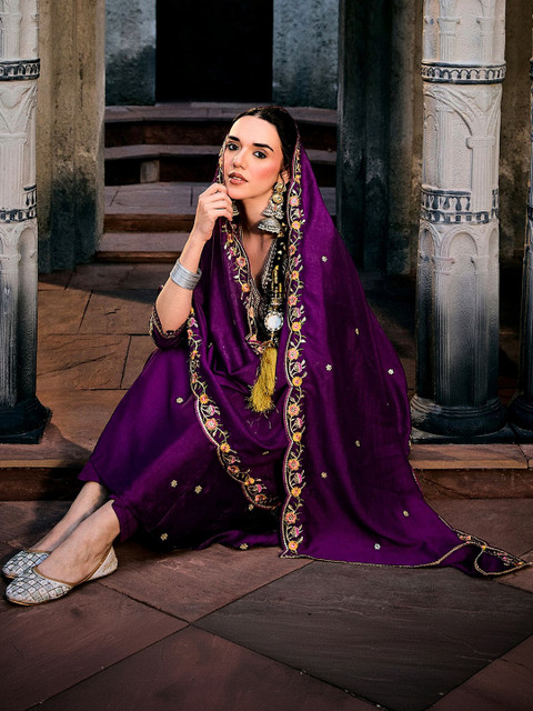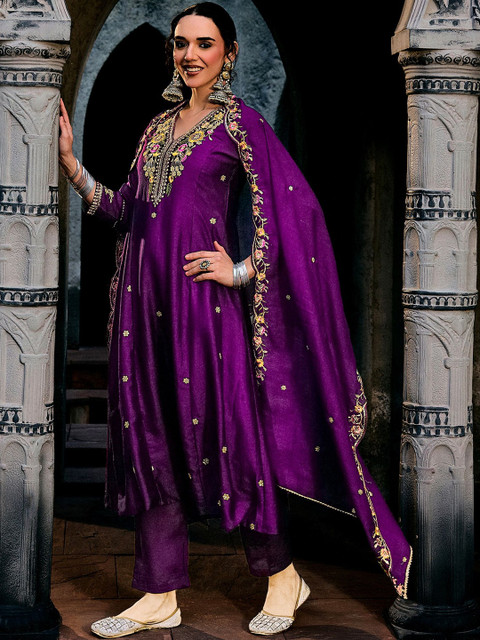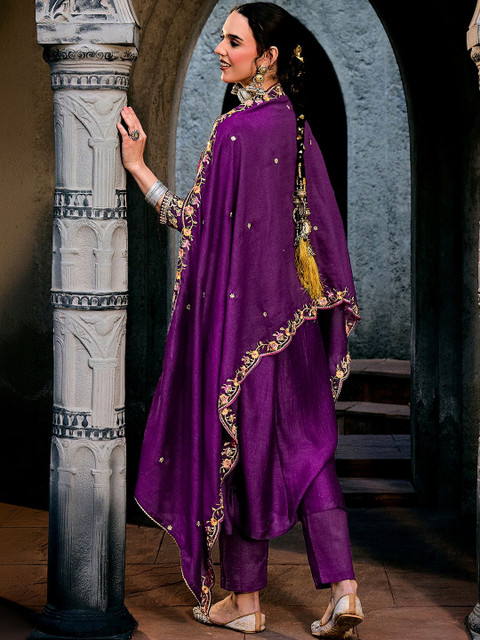 Purple Embroidered Kurta with Trousers With Dupatta