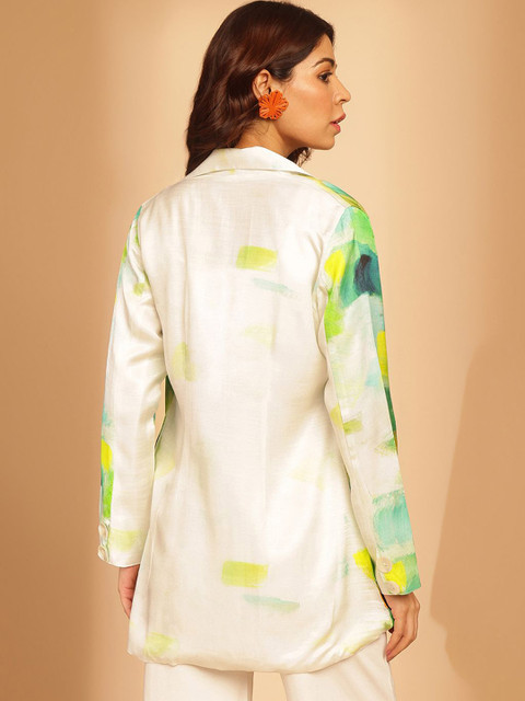 Green printed comfort-fit casual blazer, has a notched lapel collar, single-breasted with button closure, long sleeves, and straight back hem