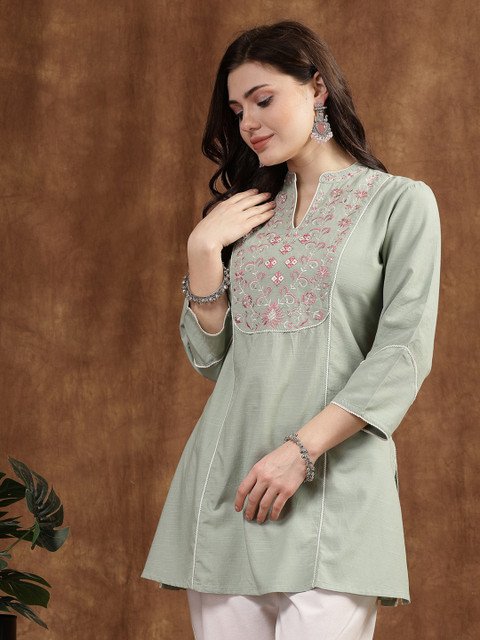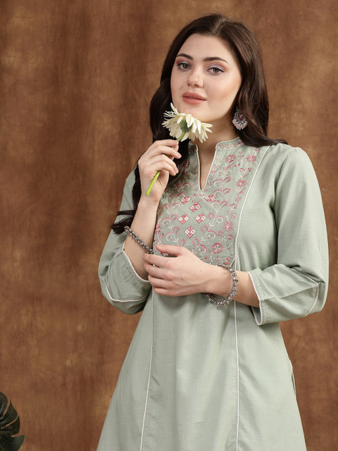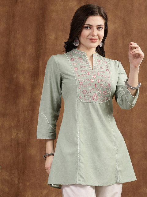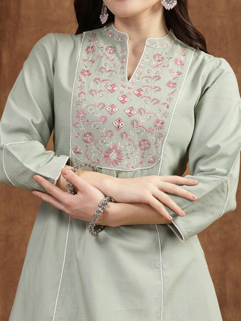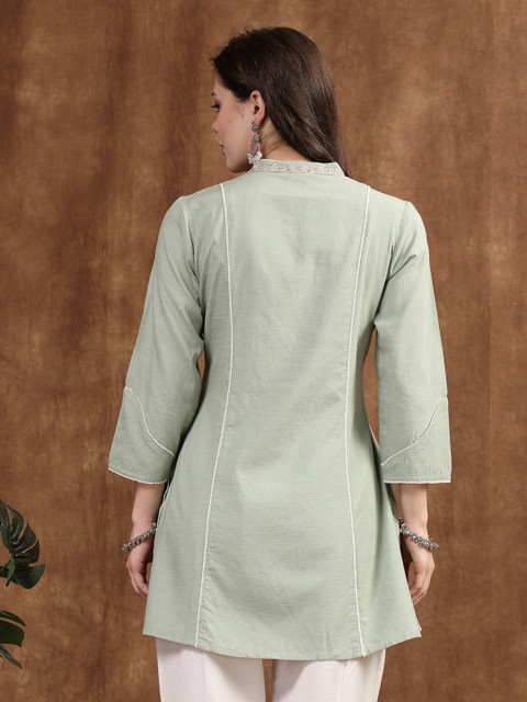 Green cotton linen kurti with mandarin collar and floral embroidery. Lace-detailed 3/4th sleeves and a smart-casual look perfect from day to night