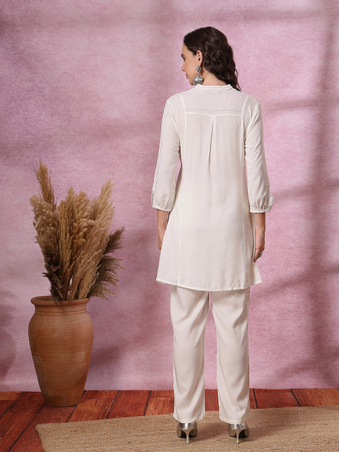 Ivory floral embroidered co-ord set in comfortable cotton-rayon fabric, featuring a mandarin collar tunic with 3/4th sleeves. Paired with a palazzo with pockets, a relaxed fit for office wear.