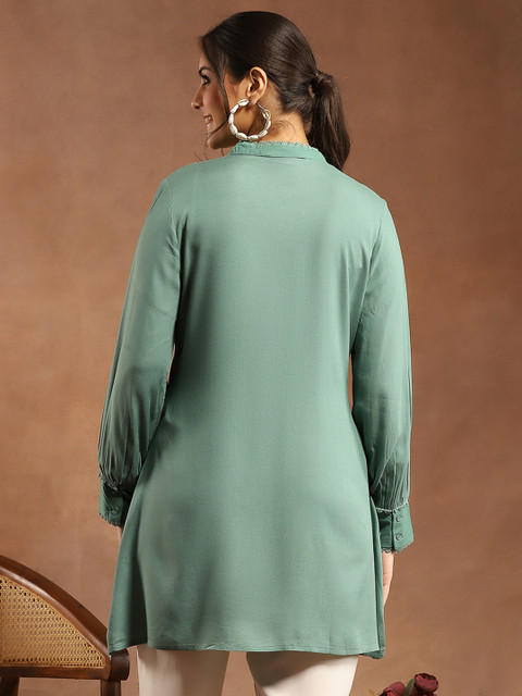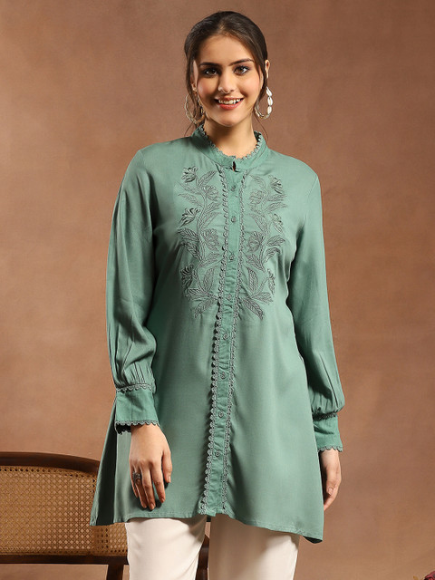 Above-knee viscose rayon kurti styled with a mandarin collar, tonal ethnic embroidery, lace-trimmed button placket & 3/4th sleeves with lace on cuff. A subtle stunner for daily or semi-casual wear.