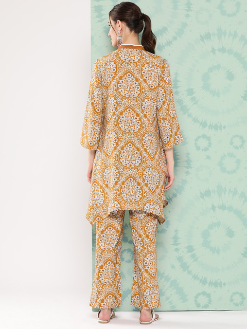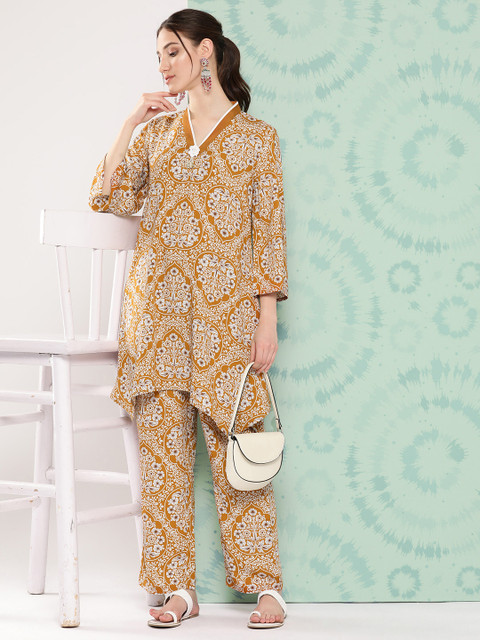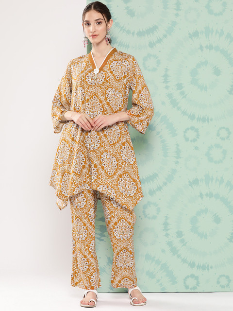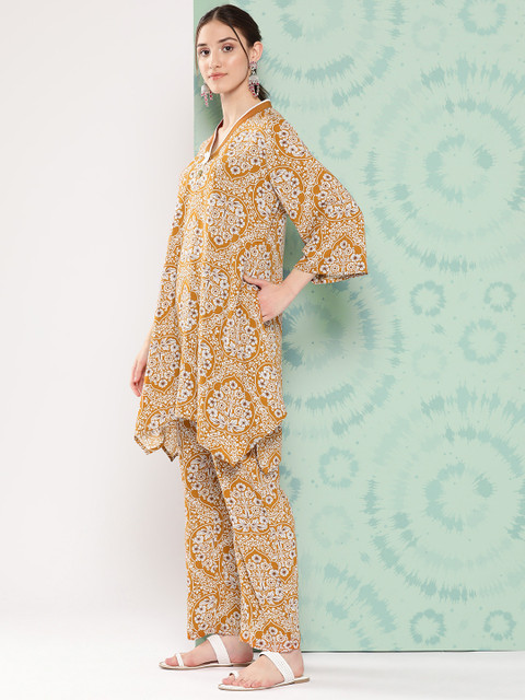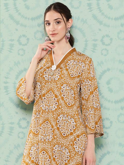 Mustard printed Tunic ,has a v-neck, three-quarter sleeves