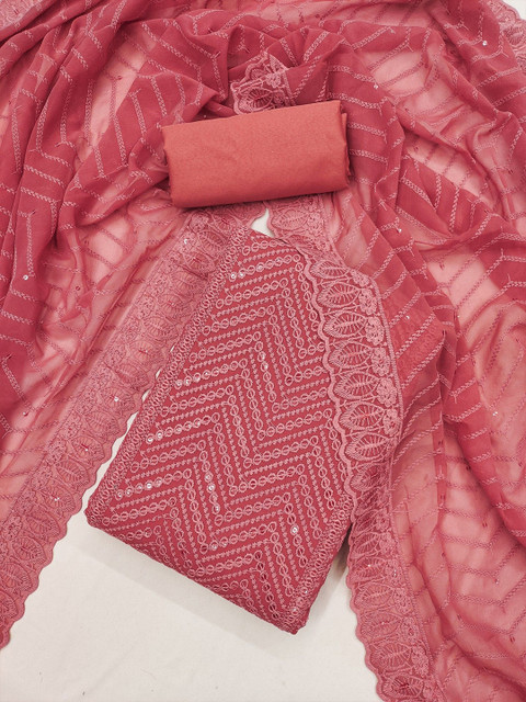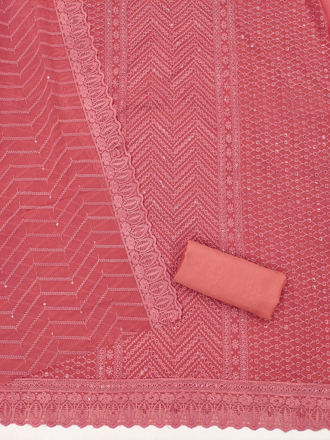 Pink embroidered unstitched dress material, has sequinned detail