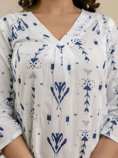 White printed tunic , has a v-neck and three quarter sleeves, secured with slip-on closure