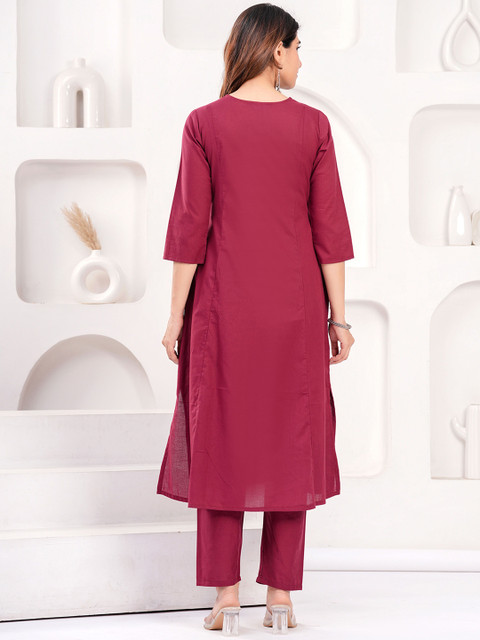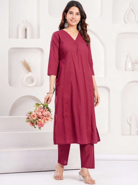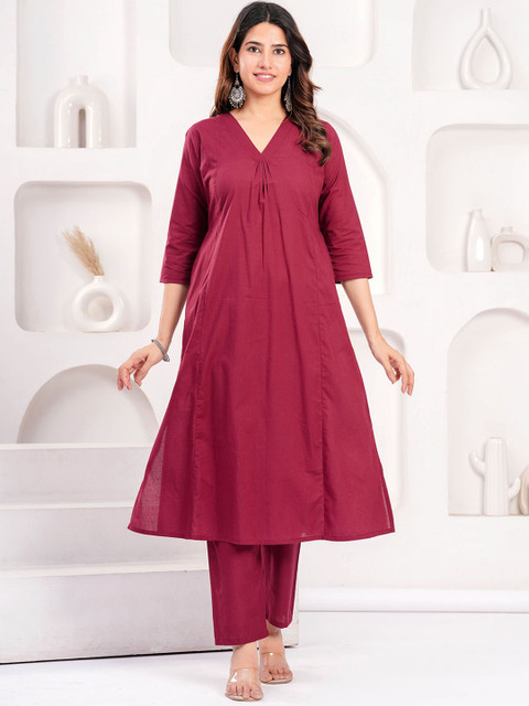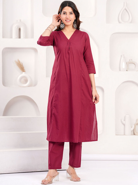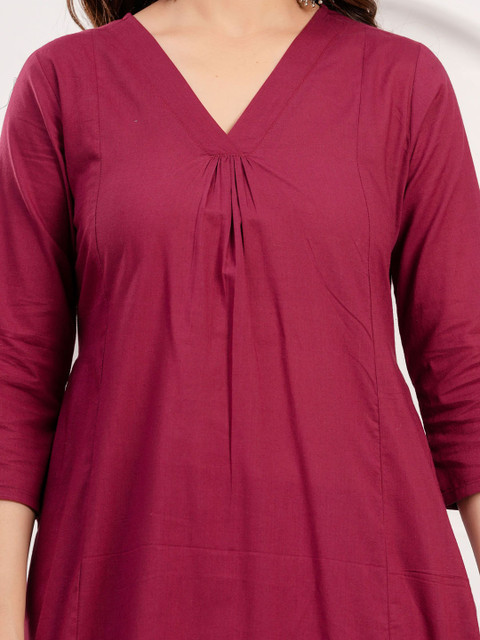 Burgundy solid tunic, has a V-collar neck and three-quarter sleeves, secured with slip-on closure