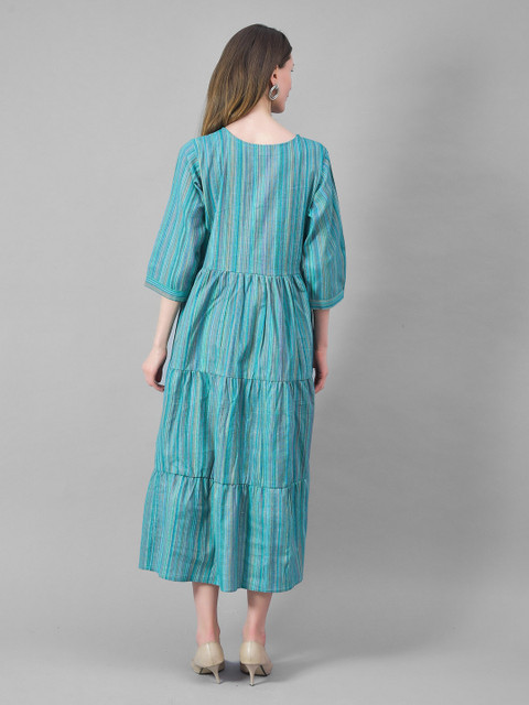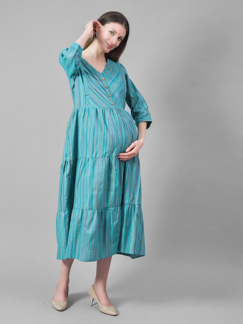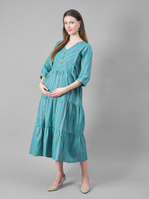 Negen Striped Printed Gathered Tiered Cotton Fit & Flare Midi Feeding & Maternity Dress