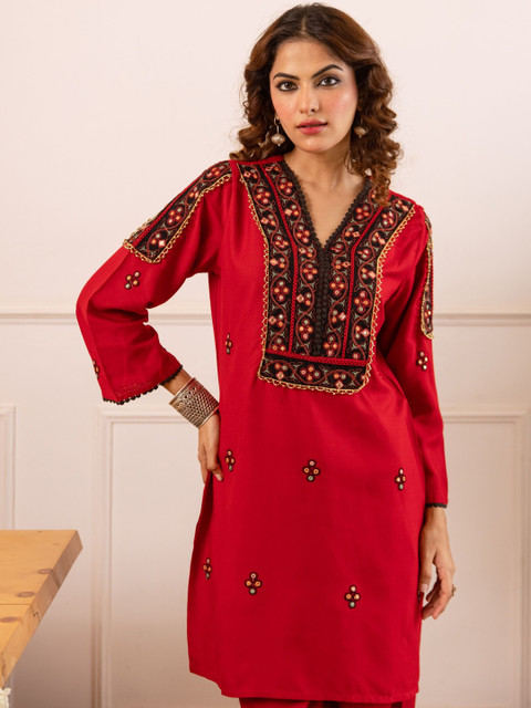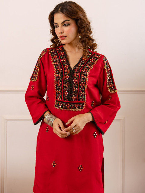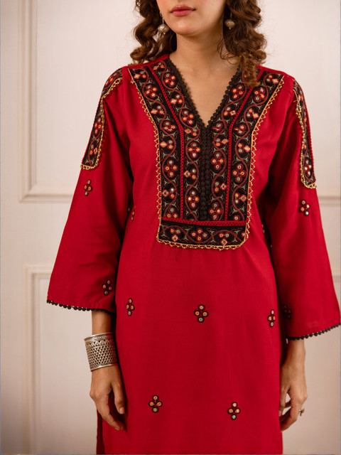 Red embroidered tunic , has a v neck and long sleeves