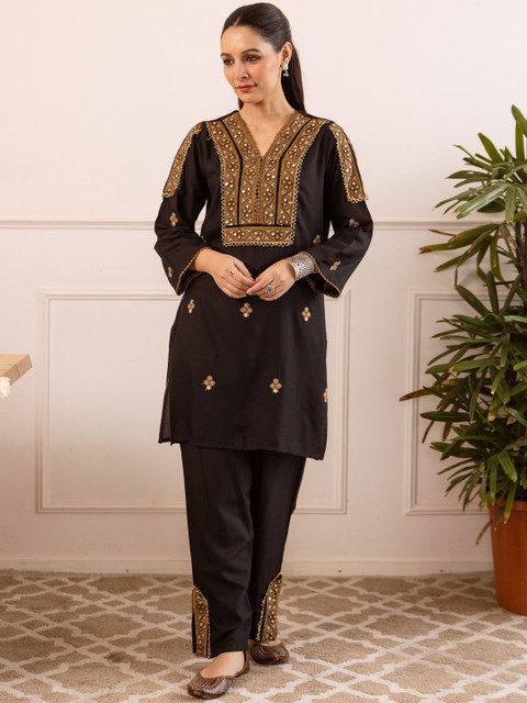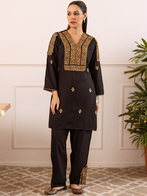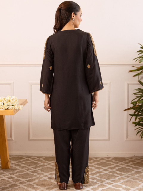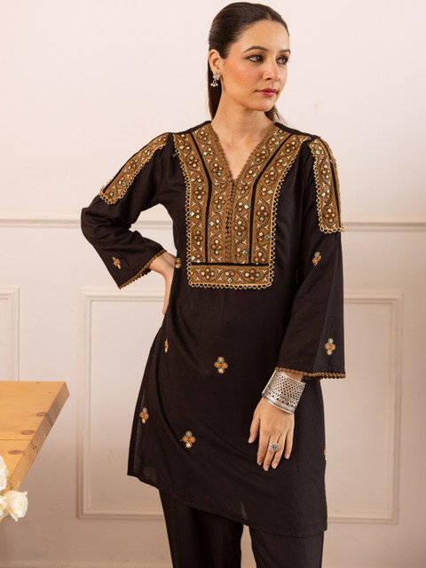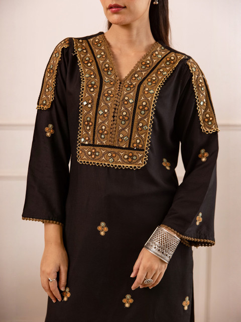 Black embroidered tunic, has a V-neck and three quarter sleeves, Secured with slip on closure