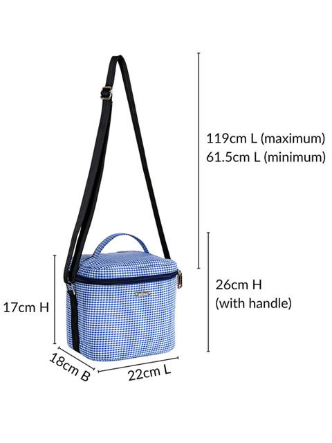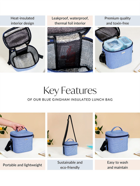 Heat-insulated interior design Leakproof, waterproof, thermal foil interior Premium quality and toxin-free Portable and lightweight Sustainable and eco-friendly Easy to wash and maintain 1 sturdy handle with 1 shoulder strap Smooth zipper system 6 litres capacity (approximately) 2 mesh inner pockets for water bottle and cutlery